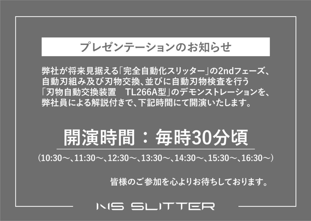 弊社が将来見据える「完全自動化スリッター」の2ndフェーズとして、自動刃組み及び刃物交換、並びに自動刃物検査のデモンストレーションを初披露いたします。